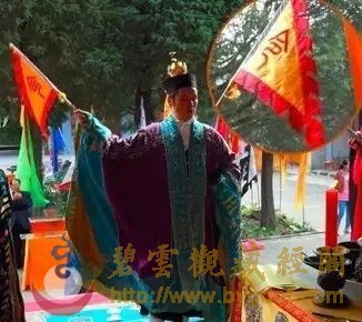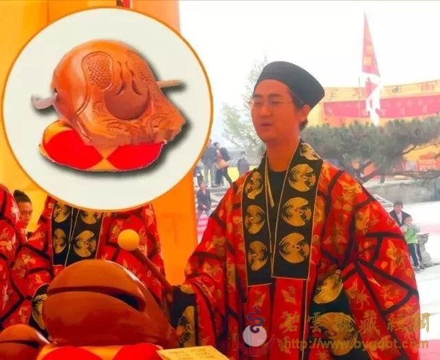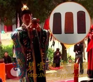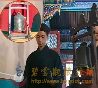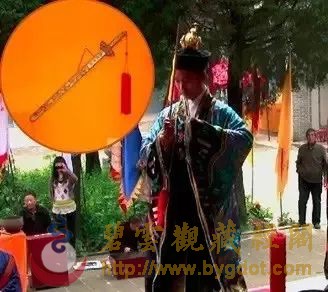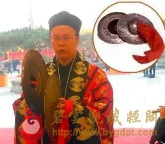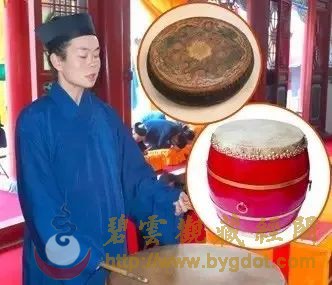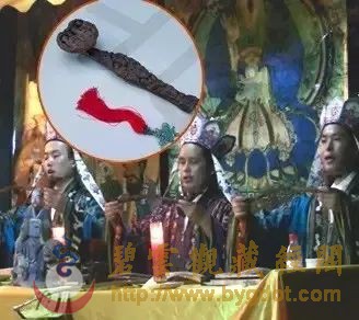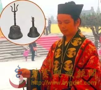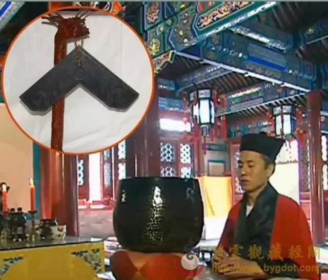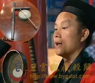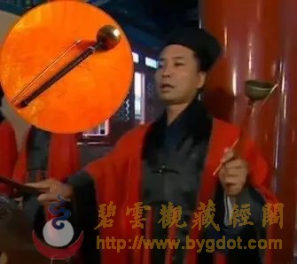| 道教斋醮法坛所需之用器,称为法器。一般在醮坛配合经韵及科仪使用,有些也可在专行法术时使用。道教法器,上可召神遣将,下可驱邪除魔,故品种繁多。以下列出十余种道教法器,希望您能有个直观的了解。 木鱼 又称“木鼓”,俗称“鱼子”。形圆而刻做鱼形,故号木鱼。中间掏空,击之有声。通常放在经案的右手边,以右手持木棰敲之。诵念经文时配合经韵而使用,经文的每个字都要落在木鱼的点子上。《无上秘要》:“木鱼清磐,振醒尘寰。” 磬 分为两种。一种称为“圆磬”,圆形而中空,铜制或铁制,一种称为“扁磬”,又叫“玉磬”,形似曲尺,曲角120°,玉石制成。道场上多用前一种,通常放在经案的左手边。磬的主要作用是通报神灵,也可以消灾解厄。平时道教徒或香客进殿朝拜,殿主在其抬头起身之时击磬。道场诵经时配合科仪,也要击磬磐。 引磬 又名“手磬”。形小如碗状,铜制,器底隆起之顶端,附有木柄,以便携持。木柄有绳,连一铁杆或铜杆。道众在醮坛朝拜或“转天尊”时,持而鸣之,用以引导道众,故名“引磬”。 钟 一般由铜或铁铸成。钟内无舌,击之发声。有大钟和小钟之别;大钟用于道观早晚开静、止静时,配合大鼓和板使用;小钟用于道场作为法器,与鼓配合击打。《道书援神契》:“古者祭乐有编钟、编磬,每架十六,以应十二律及四宫清声,又有特悬钟、特悬磬,特悬者,独悬也。今洞案金钟、玉磬,又有大钟等,皆本诸此。 鼓 圆桶形或扁圆形,边围鼓起,中空,两面或一面蒙以皮革。鼓有大小之分:大鼓用于道观早晚开静、止静时,配合大钟和板使用;小鼓在道场作为法器,配合小钟使用。鼓的声音,被认为具有通神和辟邪的作用。道教对击鼓颇有讲究,可以打出”风云雷雨”的模拟音响,且能配合经韵板眼,谓之“花点”。《太上助国救民总真秘要》:“凡建醮道场行法事时,必先鸣法鼓”。 铛 又称“单音”、“铜鼓”等,俗称“铛子”。是用小铜锣固定在长柄的木框上,用拨子敲打出声。如果是十面小锣固定于同一木架,安上长柄,则称“云锣”或“云璈”。 钹 亦名“铜盘”。一般为铜制。形状是中央隆起的圆片,在其隆起部位系有红布条。有大小之别:大的称为“饶钹”、“闹钹”或“大钹”,小的称为”钗”或“钗子”。击打时双手各持一片的布条,合击发声,也有的把一片置于圆形的凹状布垫上面,用另一片去击打。在道场上,通常和铛子配合使用。 铃 又名“三清铃”、“摇铃”、“帝钟”、“法钟”、“法铃”等。一般为铜制,有柄,铃内有舌,摇动发声。柄的上端为“山”字形,象征道教信奉的三清尊神。道教认为,法铃具有降神、除魔的作用。在道场上使用时,须以单手持之,向一边有节奏地摇动。《上清灵宝大法》:“振动法铃,神鬼咸钦。” 笏 又称“圭简”、“朝简”、“朝板”、“奏板”、“玉板”、“玉笏”、“手板”等。原是古代君臣在朝廷相见时所执的手板,上面可以记事,以免遗忘。朝中之笏有一定之制,天子用玉,诸侯用象牙,大夫和士用竹片。道教则不受此限,根据条件均可使用。举行道场时,高功登坛,双手捧笏,如对天庭。 如意 一般为玉、木、骨制成。形状略曲如“心”字,有三点:首尾两端作云形或芝形,中央一点圆形。象征“道化三清”之意,又喻一心尊三宝(即道宝、经宝、师宝)。《太清玉册》:“如意,黄帝所制战蚩尤之兵器也,后世改为骨朵,天真执之,以辟众魔。 法印 一般为木制、铜制或玉制。印面上刻着具有道教含义的文字,甚至有的还刻着完全符式化的图案,印钮一般是狮子或其他避邪兽。道教自从祖天师张道陵开始传有法印,沿袭至今。法印是道教奏达天庭的公印,也是行使神力的法物。《洞玄经》:“法印照处,魅邪灭亡。” 法剑 又名“宝剑”、“令剑”、“七星剑”。在钢铁锻制的剑身两面,各镶有青铜制的北斗七星图样,靠近剑柄处有龙、符的图案。道教认为宝剑是斩妖诛魔的强力法器,张天师的家传宝物即为宝剑及天师印。通常剑身单薄的七星剑是以两把并握使用,有时也可分持两手,又称“双剑”或“合剑”。也有一种是在剑身上刻有符咒的木剑,多半使用可以避邪的桃木雕制,又称“桃剑”。 令牌 又名“雷令”、“五雷牌”。为圆顶平底之木牌。侧面边围刻有二十八宿的名称。上圆下方的形状,象征天地。令牌是道士差遣神灵的神圣法器,有辟邪的作用,也可用于差遣雷神。令牌的形状与图案并不完全一致,如有的刻有龙或宝剑,有的刻有“五雷号令”、“总召万神”等。 水盂 又称“水盂”、“水碗”或“清水碗”。在道场上用来盛装法水(又称”甘露”)。古为竹制品,今多为黄铜制。其器如茶杯状,口略大,杯子周围绘有”五岳真形图”。但也有饭碗状的水盂,口略窄。道场上的高功,常以左手持盂,右手拿着杨柳枝(或用塑料树枝代替),沾取盂中的圣水,遍酒醮坛以示净场,《灵宝济度金书》:“杨枝洒净业垢,解除尘秽于无形。”有时象征普施甘露,济度亡魂。 令旗 为高功在醮坛发号施令的旗子。旗为三角形,旗面一般是黑色,全真用黄色,镶以齿状红边,上有一条飘带,上书总招万神符和三界兵马符,旗杆一般为木制。旗子上书“敕召万神”与北斗 镇坛木 又名“震坛木”、“奉旨”、“净板”等。为略呈长方体之木块。顶面稍有隆起,底面平坦,以漆涂成红色。正面刻有“万神咸听”四字,两端