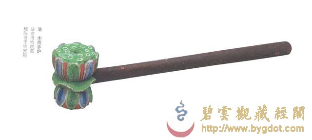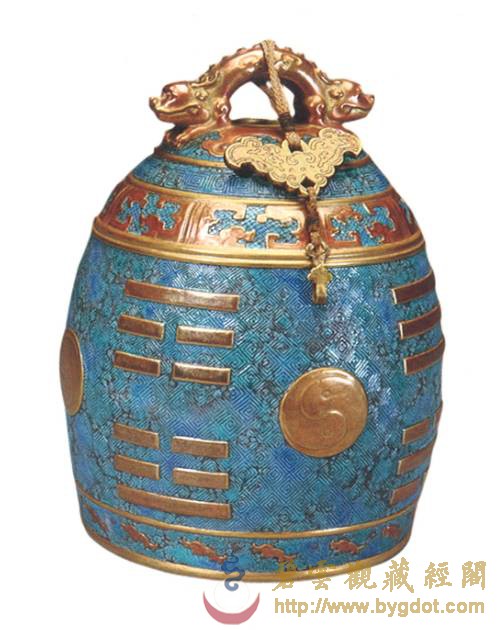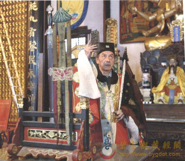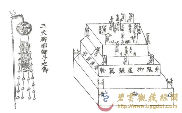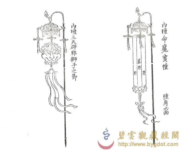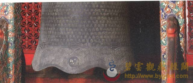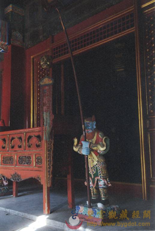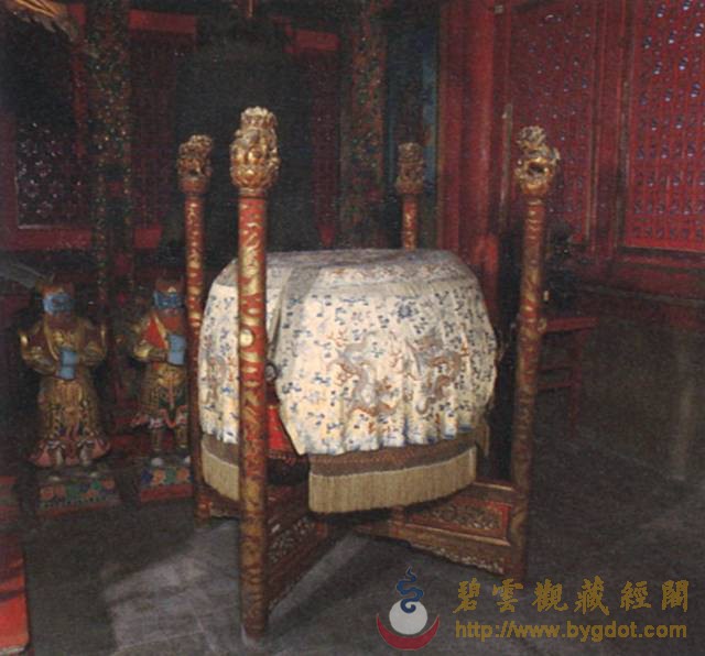| 位于御花园内的钦安殿拥有山门天一门、矮垣、左右香亭、幡杆、焚帛炉等建筑物,是一座完整的坛庙建筑群。其建制亦与当时的宫廷道场有着密切的联系。 金钟玉磬 主香案供有紫檀木架悬挂的陶瓷质地金声、玉振一对,也便是金钟、玉磬。道教斋法继承了古礼祭祀的规制,在“金箓大斋”中亦有金、玉之用。在“建坛科仪”中,法官念白:“伏以阴阳合序,资金石以通神明;幽显殊途,立辨号而昭诚信……” 苏州道士在道场中敲击钟罄 此时,“知磬法师”鸣金钟二十五响,高功法官叩左齿二十五通,集身中阳气与金钟相合,以此导和天地间之阳气。“表白法师”再振玉磬三十响,高功法师叩右齿三十通,集身中阴气与玉磬相合,以此导和天地间之阴气。最后“知磬法师”与“表白法师”“金玉交振”各三十六次,共成七十二响,法师亦叩左右齿,以此交合体内阴阳二气与身外先天阴阳之气相和,祛除坛场陈晦之气,招集群真降临。 清乾隆 仿古铜彩八卦纹瓷“金钟” 清乾隆 仿玛瑙纹鎏金边瓷“玉磬” 东西诸龛区 经桌、法器桌 钦安殿内的东西大龛前,各有覆盖黄云锻的经桌两张,按《钦安殿陈设档》记载,桌上摆放有:“木令、水盂、剑架二分、铜罄一口、木鱼一个、铜帝钟一对,锡蜡钎三对。”所以,所谓的经桌实际是高功法官、都讲法官(主管唱赞导引的高功的副手)行法所用的“法台”。 《大成金书》所刊之“外坛威仪” 清 木质手炉 “木令”即是木质令牌,主要用于“发奏科仪”中召合雷部神将及功曹的节次中:法官以右手执令牌,在虚空中作用秘法,以此配合存想、手诀以及罡步来实现人与护法神之间的沟通。“水盂”用于盛放法水,用于所有科仪开始时的净坛节次:法官以秘法取“三光、五方之真气”敕入于水中,成为“五龙荡秽法水”,然后左手以三山诀(拇指、食指、尾指伸直,呈鼎立之势,中指和无名指自然屈于手心)托起水盂,右手执法剑、捏净枝,绕坛遍洒法水,以金、水之气荡除氛秽、清净坛场。这些令牌、令旗,连同法剑、天篷尺、拷鬼杖等法器平时都安于“剑架”之上,《斗坛陈设图》中称其为“剑令架”,它作为道场中的镇坛之物,也是法官秉承正统道法、掌握神权的象征。道光十九年(一八三九年),宣宗停止了钦安殿内的道场活动,上述法器中除大铜磬外均被移往大光明殿收存。 苏州正一派法师持令牌、令旗召将 这口大铜磬现仍位于钦安殿东侧经桌原位,旁边有木盘,收置鼓槌、钟棰、磬棰等物。此外,盘中还有木质手炉三柄,也是道场中的重要之法器,其作用有二:一为斋主(钦安殿内举办的道场均为皇室祈福、拔亡,但由于皇帝不能经常亲临故往往指派王、贝勒或内务府大臣等代为拈香)跪拜瞻礼时,手中持香所用;二为法官在“三朝仪”中举行“烧香”这一仪法节次中所用,其时道众手持旌、节、幡、幢缓缓绕坛旋绕,法官持手炉尾随,一同唱诵仙乐,烧香供养诸天上圣。 铜钟、鼍鼓 钦安殿内西侧现存有大鼓一面,它的形制及大小均与丹陛大乐大鼓相仿,唯独不同的是,它的鼓面并未描绘龙纹,而是由一整张鳄鱼皮所蒙就。此鼓即是《钦安殿陈设档》中所记“大龙皮鼓壹面”。其所为之龙,当指即鼍龙(扬子鳄)而言。据传上古帝王颛顼喜好音乐,以扬子鳄鸣声如鼓而令其执掌音乐。后世以此为据,取其皮蒙鼓,名为“鼍鼓”,《诗经·大雅》中便有“鼍鼓逢逢(音pang”的诗句。 清 红漆描金鼍鼓及局部 鼍鼓南侧,是明朝弘治(一四八九年)铸造的大铜钟,悬挂于满饰五彩祥云的钟架之上。大钟自上而下铸有正楷书写的《元始天尊说北方真武妙经》、《太上泰清天童护命妙经》及《太上金光护身咒》,经文最上方第一字“元”开始向西旋转释读,至下方最后一字“玄”结束,暗合“玄元”之意。最下方钟裙处铸有《元始无量度人上品妙经》(以下称《度人经》)之《元始灵书中篇》符文。根据图形考据,它与《正统道藏》中《上清灵宝大法》、《灵宝无量度人上品妙经符图》所收录的两个版本基本一致。 明弘治 刻元始天尊说北方真武妙经大铜钟及局部 钦安殿铜钟钟裙所刻《元始灵书中篇》与《正统道藏》内容比较 《元始灵书中篇》代表的是“化生天地的大道之气”,其所包含的“隐韵内名”亦是“天地之正音”,如能依法按照正音唪诵《元始灵书中篇》,则可“道备克得、升入金门”。若依法抄写此玉字或安镇或佩戴,则可以“万灾不干,神灵拥护”。钦安殿大钟仿效永乐大钟的形式,将《元始灵书中篇》的云篆铸于钟上,以此保佑皇室、安镇国祚。 抱厦区 清代曾在原钦安殿月台上增建抱厦一座,根据诸本陈设档案的行文记载顺序来看,当时抱厦内陈设有“红漆描金小卷书案”一张,“请命魔幡二首”的香胎“纵(疑为从)神”两尊,安放经卷的“经格子”两座,“满汉大签筒”一个,另有拜垫、羊角灯等什物。 小香案 “红漆描金小卷书案”现存钦安殿神食后夹道内,按照陈设档案记载,其上曾陈设有:“玉令十二面、玉尺一件、木令十三面、乾隆款黄玻璃花瓶一对、套红玻璃水盂一件、霁红瓷小供水缸一件、铜珐琅小匙箸瓶一件、铜珐琅小香盒一件、古铜兽面炉一件、古铜钵盂炉一件、龙眼菩提数珠一盘、小古铜五供一分(份)。”根据以上所陈设的香炉、令牌等重要物品来推断,它当时位于抱厦正中,也就是“斗坛陈设图”中瞻礼人前香案之位置